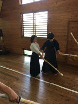 級審査の後は、激烈な指導稽古です。先生方に果敢にかかっていきます。いつもより気合いが入った稽古であっという間の1時間でした。休憩をはさんで、お互いの稽古が行われ、あちらこちらで激しい戦いが行われていました。どの組み合わせも堂々とした積極的な稽古で、合宿を通して一回り大きく成長したことが見て取れる稽古内容でした。