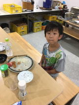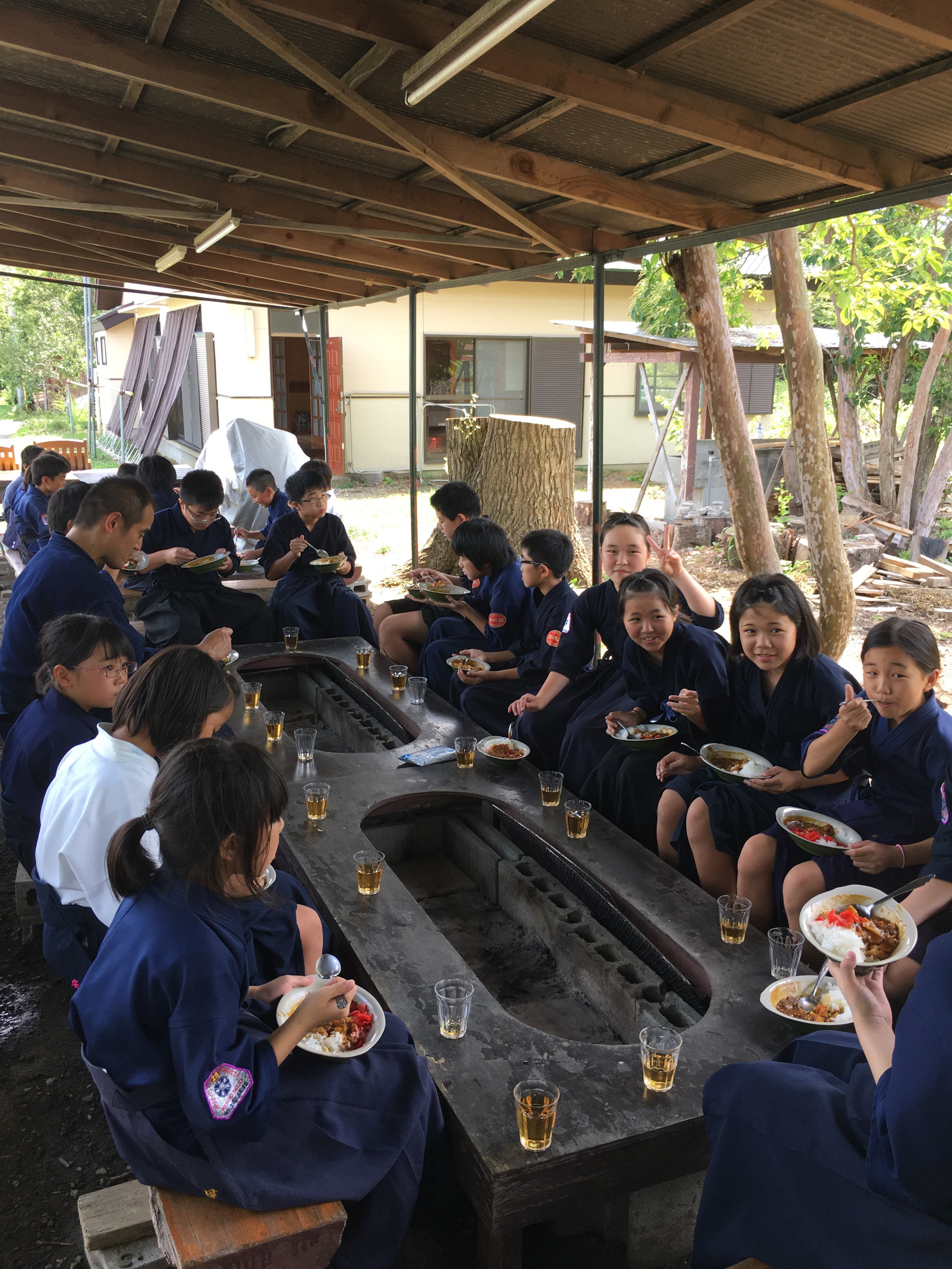 昼食には北辰館特性キノコカレー、おかわり自由!食べ放題にテンションをあげるところですが、午後の稽古を考えると、ちょっとセーブしてと考える子供たち。そんな中で、D君がまさかの大盛おかわりさく裂。きっと午後の稽古で大変なことになるだろうなぁとまたも薄ら笑いを浮かべるA先生、闇が深いです。